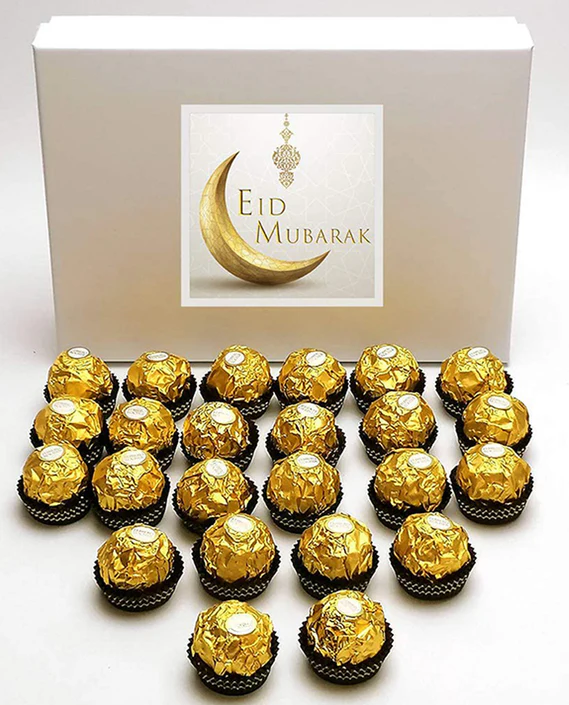 Celebrate Eid with Our Eid Gift Pack, featuring Ferrero Rocher chocolates that add a touch of luxury to your festivities. Each chocolate is a delicious blend of smooth chocolate and crunchy hazelnut, making it a special treat for the occasion.