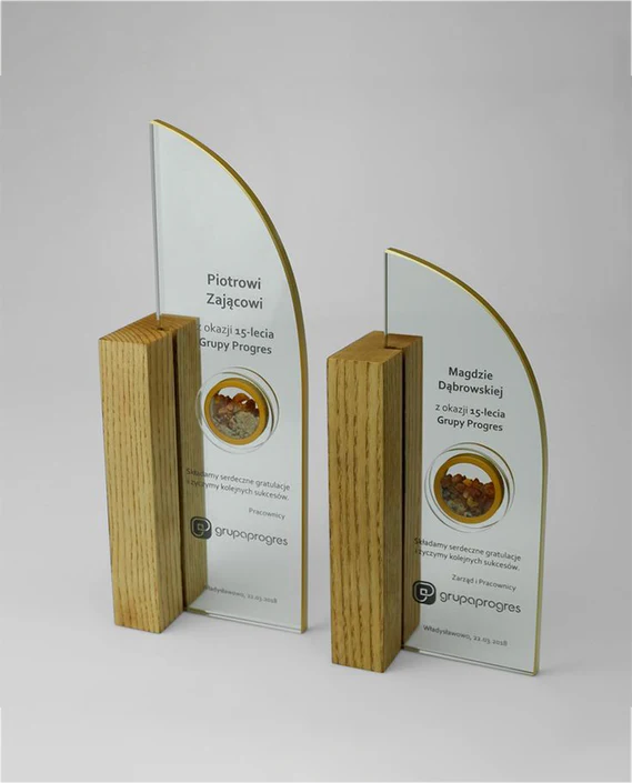 This award features a beautiful mix of wood and crystal, creating a unique design.
