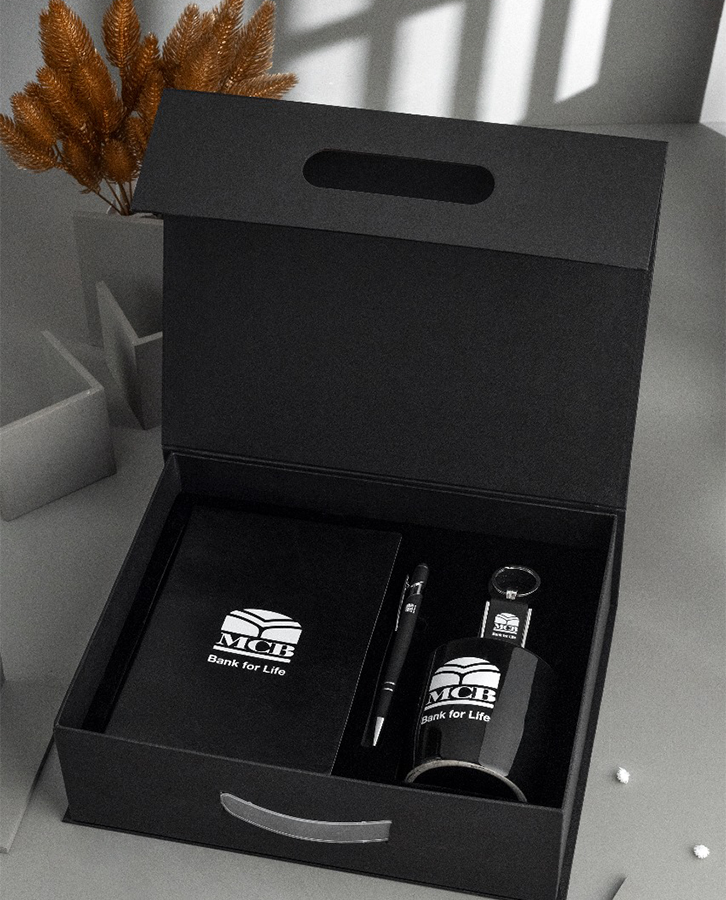 Introducing our Luxury Giveaway Box, a thoughtfully curated collection designed to enhance your workday. Inside, you’ll find a stylish diary, a classic ceramic coffee mug, a premium pen, and a metallic keychain, all neatly packed in a premium box.