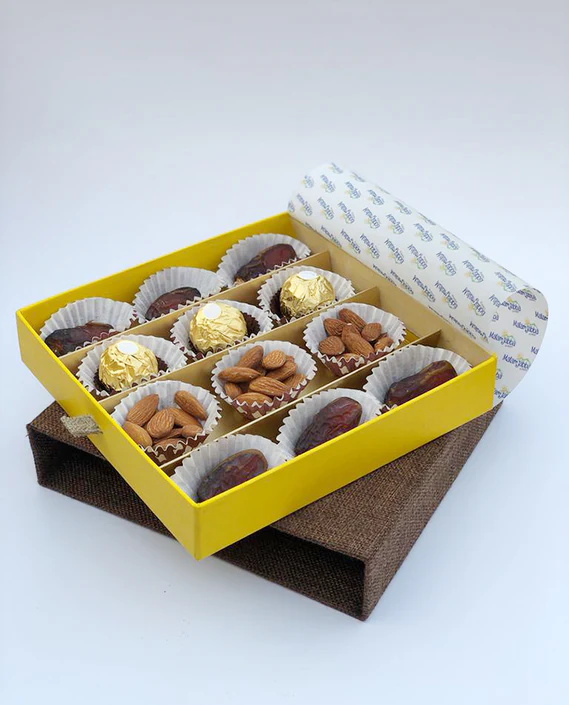 Our Ramadan Jute Box is a wonderful gift for the Ramadan season, featuring a tasty assortment of dates, almonds, and Ferrero Rocher chocolates. Each item is selected to add a touch of sweetness and flavor to your celebrations.